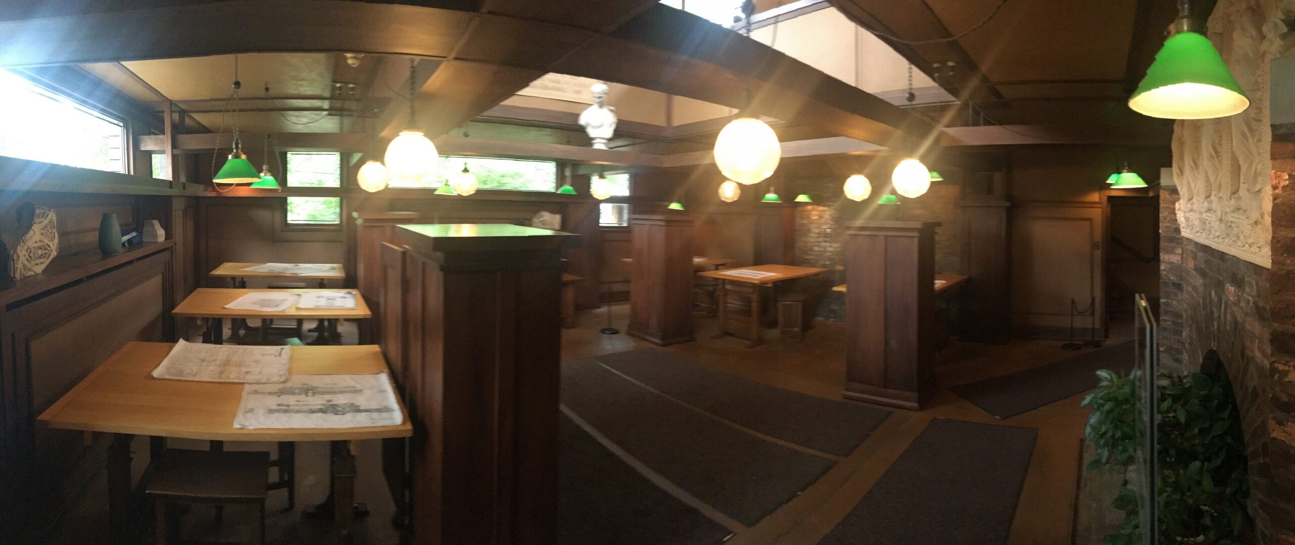 In Oak Park, einem wunderbar ruhigen Villenvorort von Chicago, haben wir sein Wohnhaus und Architekturstudio besucht. Frank Lloyd Wright war der erste Architekt, der mit den Häusern im Prairiestil einen eigenen amerikanischen Baustil geprägt hat, der nicht von europäischen Vorbildern beeinflusst war. Sein Vorbild waren die horizontalen Weiten der Prairien im Südwesten der USA. Die Wohnhäuser  sollten sich der landschaftlichen Umgebung anpassen und den Bewohnern ein Höchstmaß an Geborgenheit und Behaglichkeit bieten.