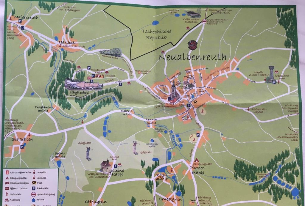 Unser nächstes Hotel in Sibyllenbad, dem Kurzentrum von Bad Neualbenreuth, liegt auch fernab von viel Zivilisation. Doch dann liegt an der Rezeption dieses kleine Blättchen aus und es macht mir Lust auf den Mittelpunkt Europas, den Grenzturm, eine Grenzüberschreitung und auf die Vulkanlandschaft. Davon hatte ich bislang nichts gehört. Mal schauen …