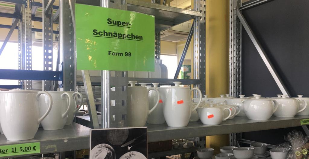 Wir sind tatsächlich zu einigen Porzellanfabriken gefahren, angefangen in Schönwald. Dieser Ort liegt nur wenige Kilometer von dem neulich in den Medien beschriebenem C-Hotspot entfernt. Wir wollen nur kurz den Werksverkauf anschauen. Schönwald produziert die Form 98 seit den 30-er Jahren. Der Name sagt erstmal nichts, aber die Firma Dibbern hat aus Solid Color ein recht verbreitetes Geschirr entwickelt. Wir haben es zuhause und benutzen es sehr gerne.