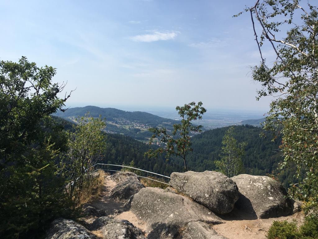 Die Landschaft wird dann nochmal sehr waldig und steil mit wunderbaren, riesig großen Hinkelsteinen. Jan geht einen steilen Weg am Hang hinunter zu den Gertelbach-Wasserfällen im Bühlertal, während ich bereits den weiten Blick in die Ebene zum Rheintal Richtung Frankreich genieße.
