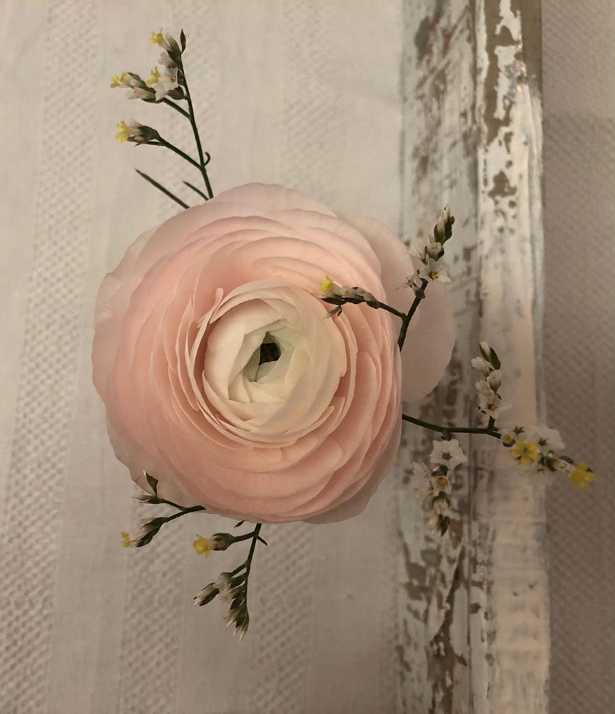 Der Anblick dieser zarten Blüten ist eine Wohltat für meine Augen und meine Seele. Aber besonders schön finde ich das Zusammenspiel mit der weißen Kunst. Marion, eine befreundete Künstlerin in München, hat mir dieses Holzstückchen in ein Kunstobjekt mit einer wunderbar vielfältigen Struktur verwandelt.