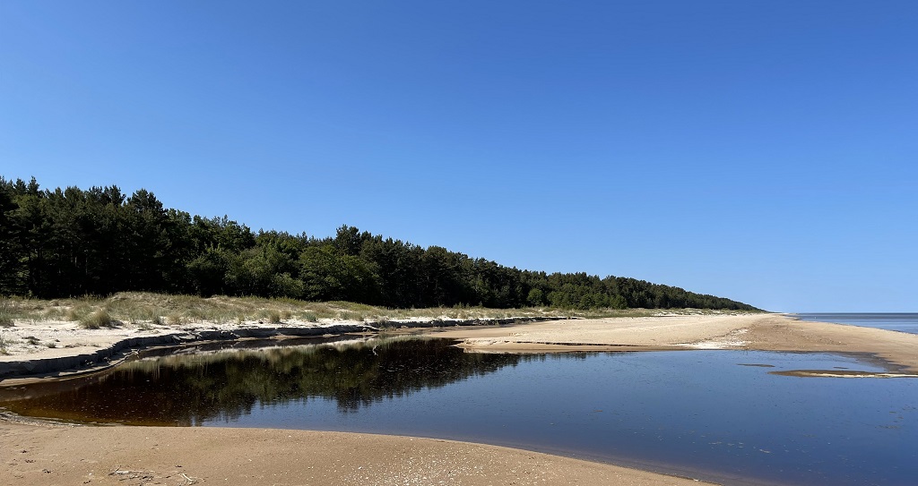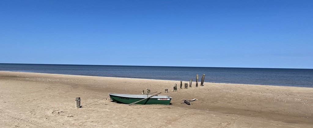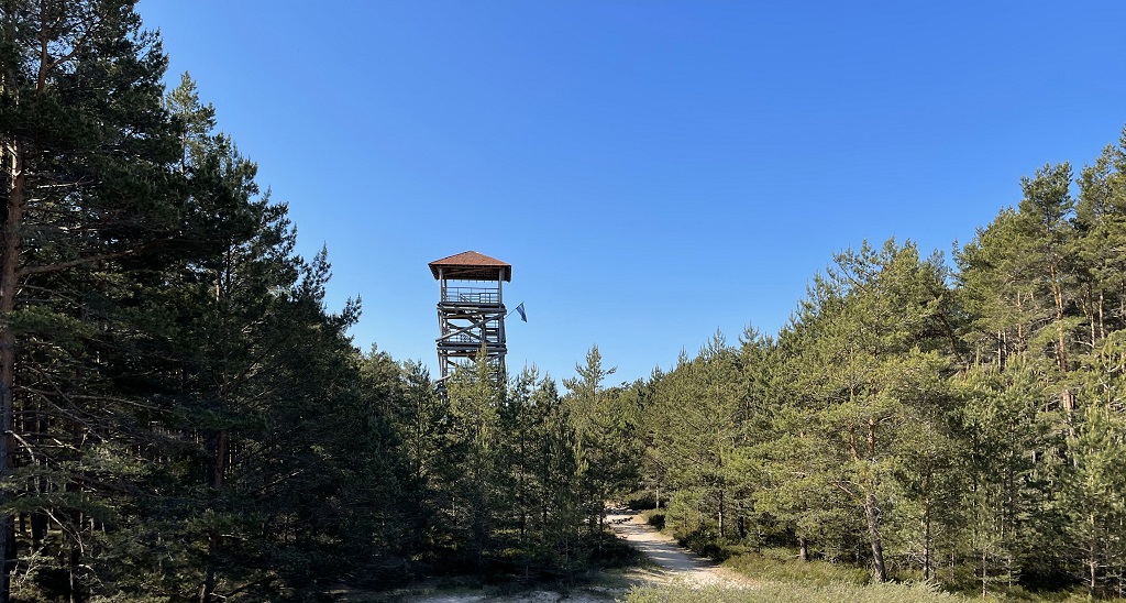 Dann noch schnell Sonnencreme auftragen und die Wasserflasche von meinen Vermietern mit gefiltertem Wasser auffüllen lassen. Gestern hatte man mir an einem Touristenkiosk empfohlen am Strand zu den nächsten drei Dörfern zu fahren und zurück durch den Wald oder über die Strasse. Also los, ich fahre erstmal wieder zum Kap und besteige einen Holzturm. Leider überragt er die umstehenden Baumwipfel nicht, keine Ahnung warum es ihn gibt. Die nächsten 15 km am Strand lang sind perfekt, man gewöhnt sich schnell an den festen Sand. Es gibt zwar Reifenspuren, ich begegne aber niemandem, außer einem Reiherpärchen das sich von mir nach Süden treiben lässt. Alle paar hundert Meter stehen sie wieder im seichten Wasser, lassen mich aber nie wirklich nah ran.
