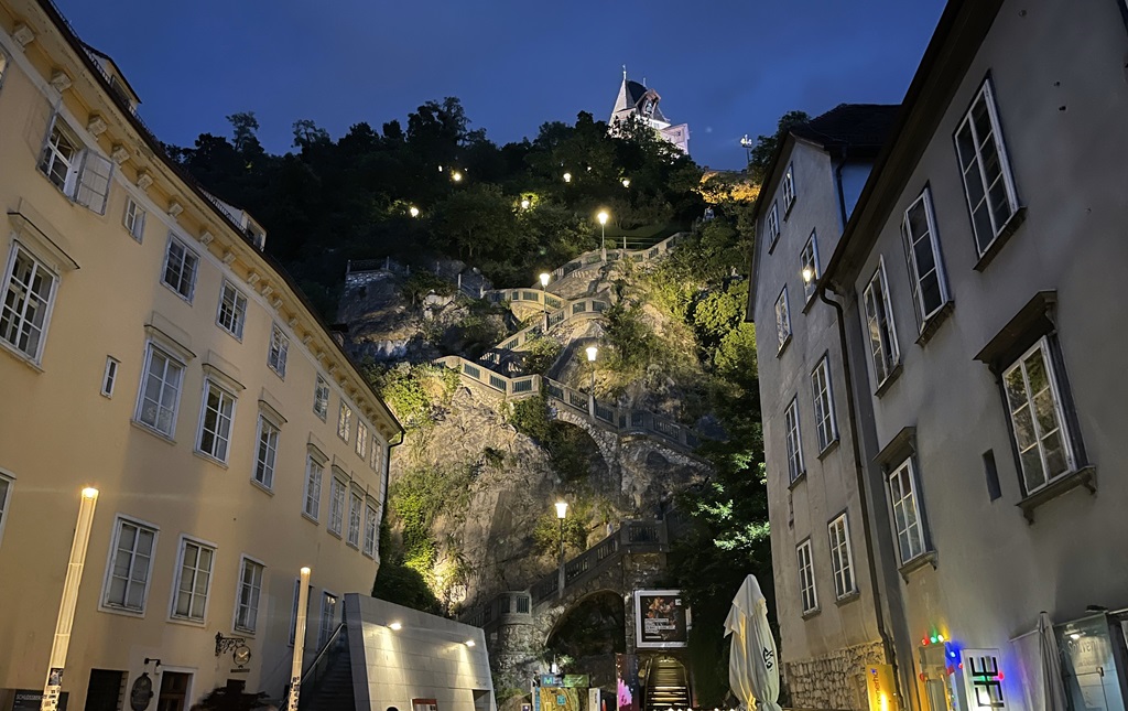 Zurück im Regen steige ich dann doch zur Burg hoch und geniesse den Rundblick über Graz. Die Architektur ist südlich, man merkt schon das man auf der anderen Seite der Alpen ist. Glockenturm, Uhrenturm und Kasematten sind übriggeblieben. Die Wehrmacht hat den ganzen Felsen ausgehöhlt und für 40.000 Menschen Bunkertunnel gegraben. Manches kann man besichtigen oder es finden Veranstaltungen darin statt.