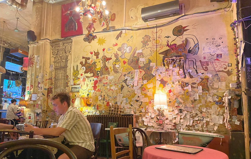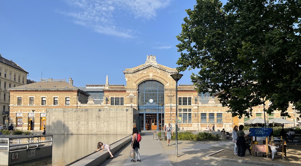 Ich habe mich nach einem authentischen, ungarischen Restaurant durchgefragt und lande im Plastikstuhl auf dem Bürgersteig, Tisch mit rotkarierter Decke inclusive. Die ältere Dame am Nachbartisch raucht ihr Pfeifchen sehr genussvoll. Gegenüber leuchtet eine schicke Markthalle in der Abendsonne. Zu Mittag hatte ich nur ein Eis, bin wirklich extrem hungrig. Der Kellner bringt den originalen Syrup mit Soda, Geschmacksrichtung Kirsche, Kindheitserinnerung-süß. Das Gulasch mit Frischkäsenockerln war sehr lecker und ich kann wieder denken. Jetzt muss ich, wie versprochen, noch in die Kneipe in der ich den Tipp bekommen habe.