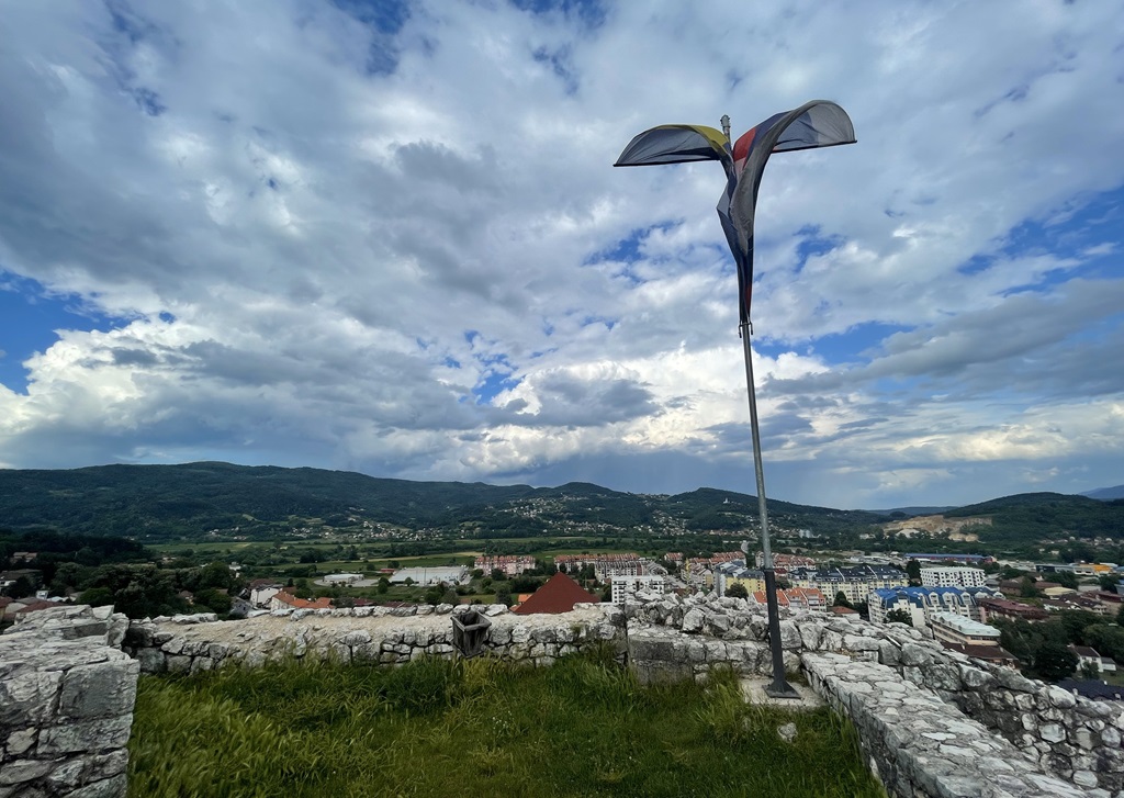 Über der Stadt thront das Fort von Doboj. Ein kleiner Anstieg nach dem Mittagessen tut gut und es ist schön windig bei 27 Grad. Der Rundblick zeigt mehr Moscheen als Kirchen, alles ziemlich neu gebaut, ich weiß doch wenig über das Land. Das Internet sagt 51% Muslime, 31% Orthodoxe, passt mit der Verteilung der Gotteshäuser.