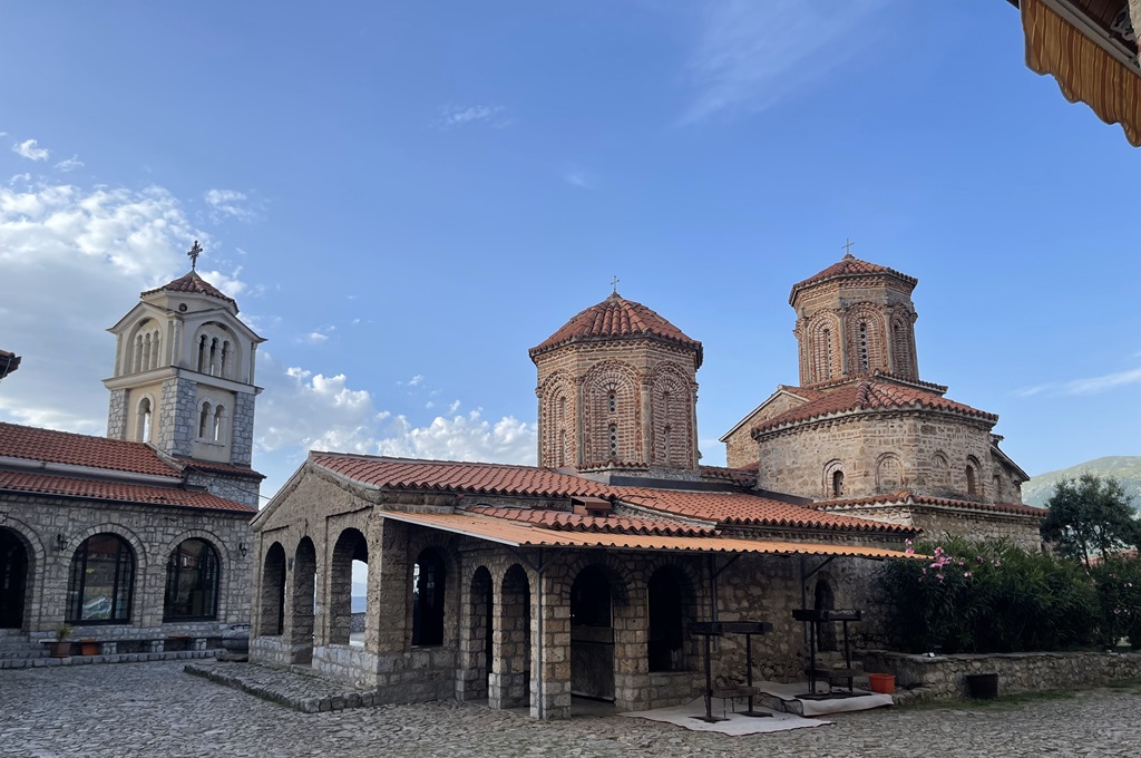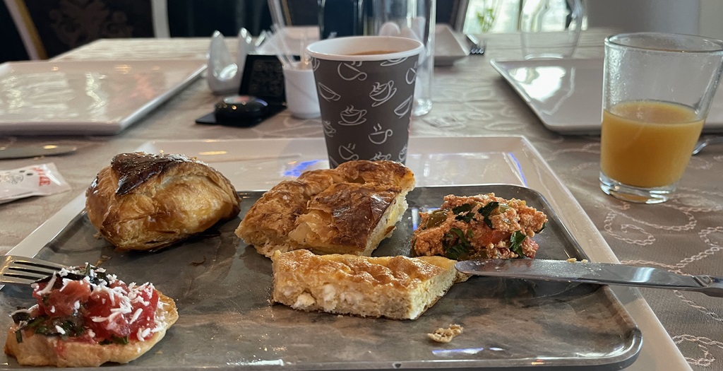 Heute morgen hatte ich noch mal das schöne Frühstück in meinem Hotel, es gibt fertiges Omelett mit Käse, Schinken oder Gemüse, Börek, warme Käsecreme, Bruschetta, Gebäck und Kuchen, Äpfel und Pfirsiche. Ich kann mich gut gesättigt auf die Reise Richtung Ohridsee machen.