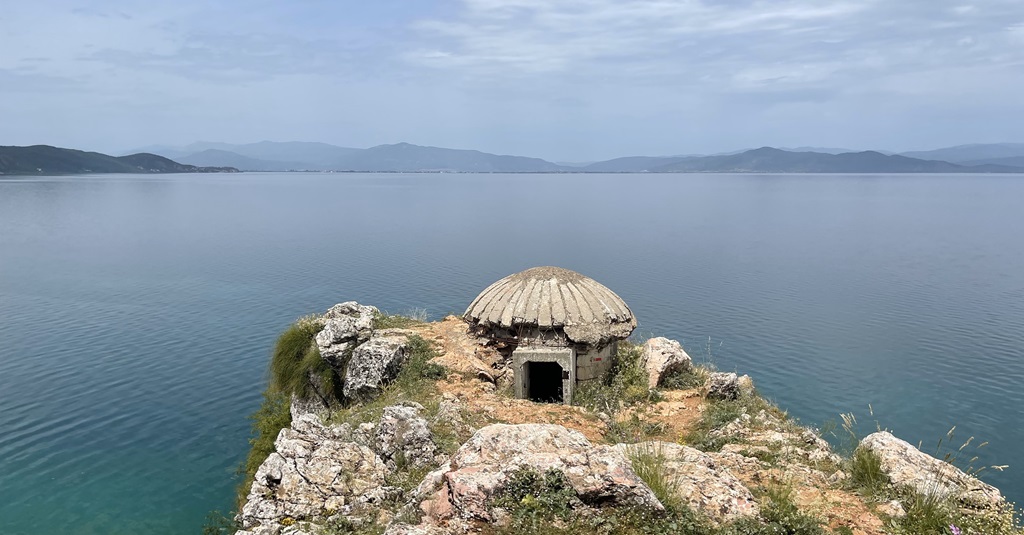 Die Fahrt ist sehr abwechslungsreich, direkt ausserhalb Tiranas fangen die bewaldeten Hügel an und die Strasse windet sich zwischen ihnen durch. Je näher wir an den Ohridsee kommen desto schroffer werden sie. Der letzte Pass und die Grenze liegen fast auf 1000 m. Die Anzahl Bunker nehmen zur Grenze hin stark zu. Die Bauweise ist immer die gleiche, Kuppel mit niedrigem Raum darunter, evtl. Schießscharten.