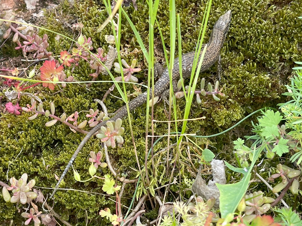 Auf der Wanderung zwischen Felsen und Wasser, begegnen mir noch quietschgrüne Echsen, eine Blindschleiche und braune Echsen. Die Grünen wissen dass man sie gut sieht und sind gleich weg, diese Braune konnte ich gut fotographieren. Für die Schlange war ich einfach zu langsam.