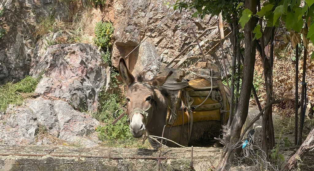 Die Einheimischen schauen erstaunt warum die verrückten Touristen bei der Hitze unterwegs sind, selbst der Esel mach Mittagspause, ist aber noch in Arbeitsstimmung.