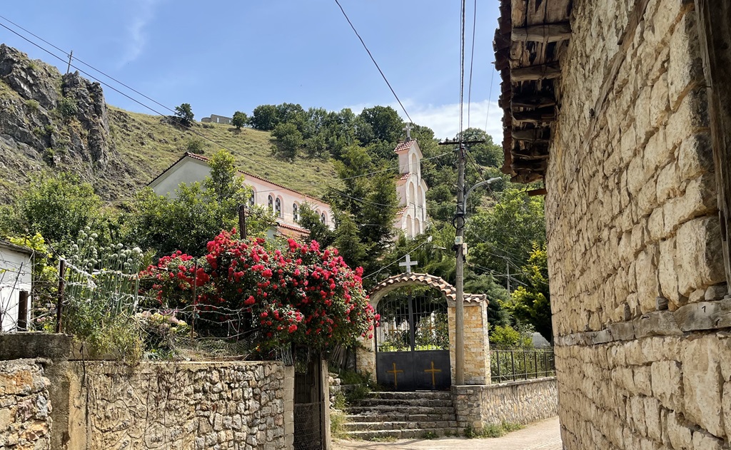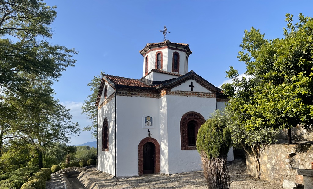 16:30 entscheide ich weiterzufahren und in Albanien am See zu übernachten, in Pogradec. Also habe ich bis nach dem einchecken kein Internet mehr. 16:40 kam die Mail mit der Bescheinigung, schade für die mazedonische Wirtschaft. Ich bin allerdings so nah an der Grenze, das ein Ausflug mit dem Fahrrad sinn macht. Ich habe eigentlich kein Ziel und wenn es mir zu weit ist zur Grenze, fahr ich wieder um. Wie das halt so ist, wenn man schon auf dem Fahrrad sitzt, kann man ja auch weiter fahren. Nach der Grenze treffe ich auf eine kleine orthodoxe Kapelle am Straßenrand, es scheinen auch Mönche dort zu wohnen, es riecht noch nach Weihrauch.