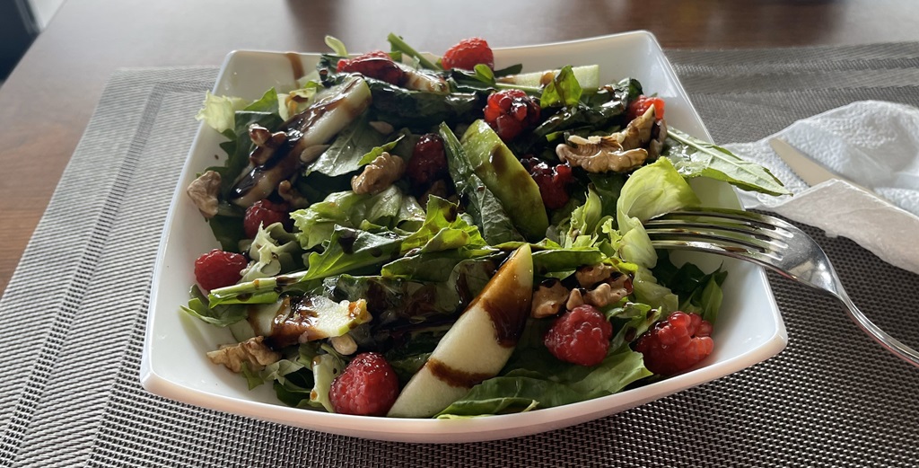 Ich fahre wieder rauf zu meiner Tankstelle um zu schauen ob ich schon eine Versicherungskarte habe. Leider noch nicht, also gehe ich in das Restaurant neben der Tankstelle um Mittag zu essen. Ich hatte vorher schon einen Kaffee und ein Wasser getrunken und der netten Bedienung 1€ Trinkgeld gegeben. Zahlt sich jetzt aus, ich bekommen einen schönen Salat mit Äpfeln, Walnüssen und Himbeeren.