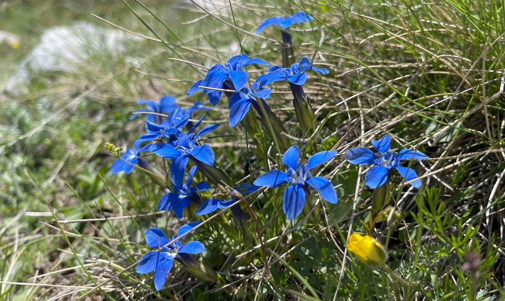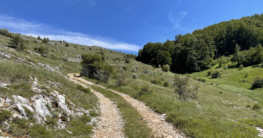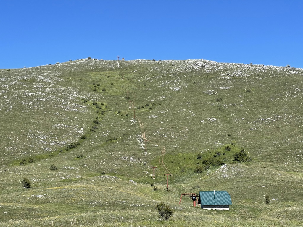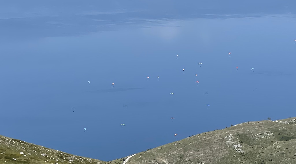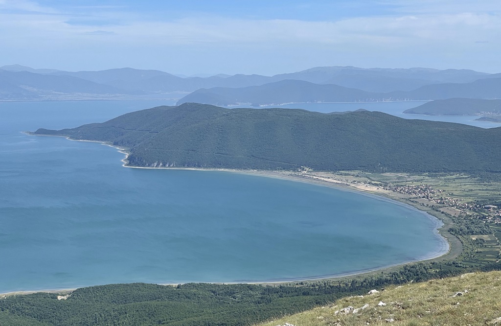 Ich gehe aber dann doch erstmal die Wanderung zum zwei Seen Blick. Ist gut ausgeschildert und auf Komoot verfügbar. Wenn ich gewusst hätte dass man den Gipfel die ganze Zeit sieht, hätte es mich sicher schon genervt, 700 Höhenmeter und nur bergauf. Es ist aber sehr Abwechslungsreich, erst durch schönen Buchenwald, dann durch niedrige Büsche und die zweite Hälfte komplett durch offenes Terrain. Sehr schöne Bergblumenwiesen, leider noch nicht in kompletter Blüte aber trotzdem schön anzusehen und durchzustapfen. Leider ist eine komplette Schulklasse unterwegs und ich muss mich durchschlängeln, man kann ganz gut die unterschiedliche Motivationsgrade betrachten. In Richtung Ohridsee sind jetzt viel Paraglider unterwegs, schöne Farbklekser, es ist heute etwas diesig.
