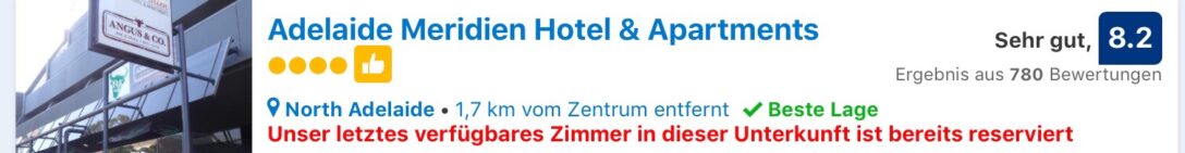 Für Adelaide buchen wir zunächst 1 Nacht, die Hotels sind ziemlich teuer. Wir werden vor Ort weitersuchen. Das Adabco Hotel sieht ganz nett aus, wir würden gerne bis zu unserer Weiterfahrt mit dem Ghan am Sonntag hier bleiben. Aber es ist ausgebucht. Wir bekommen den Tipp, bei einem 5 Sterne Hotel nachzufragen. Da würden wir… Weiterlesen Reisen ist auch Stress